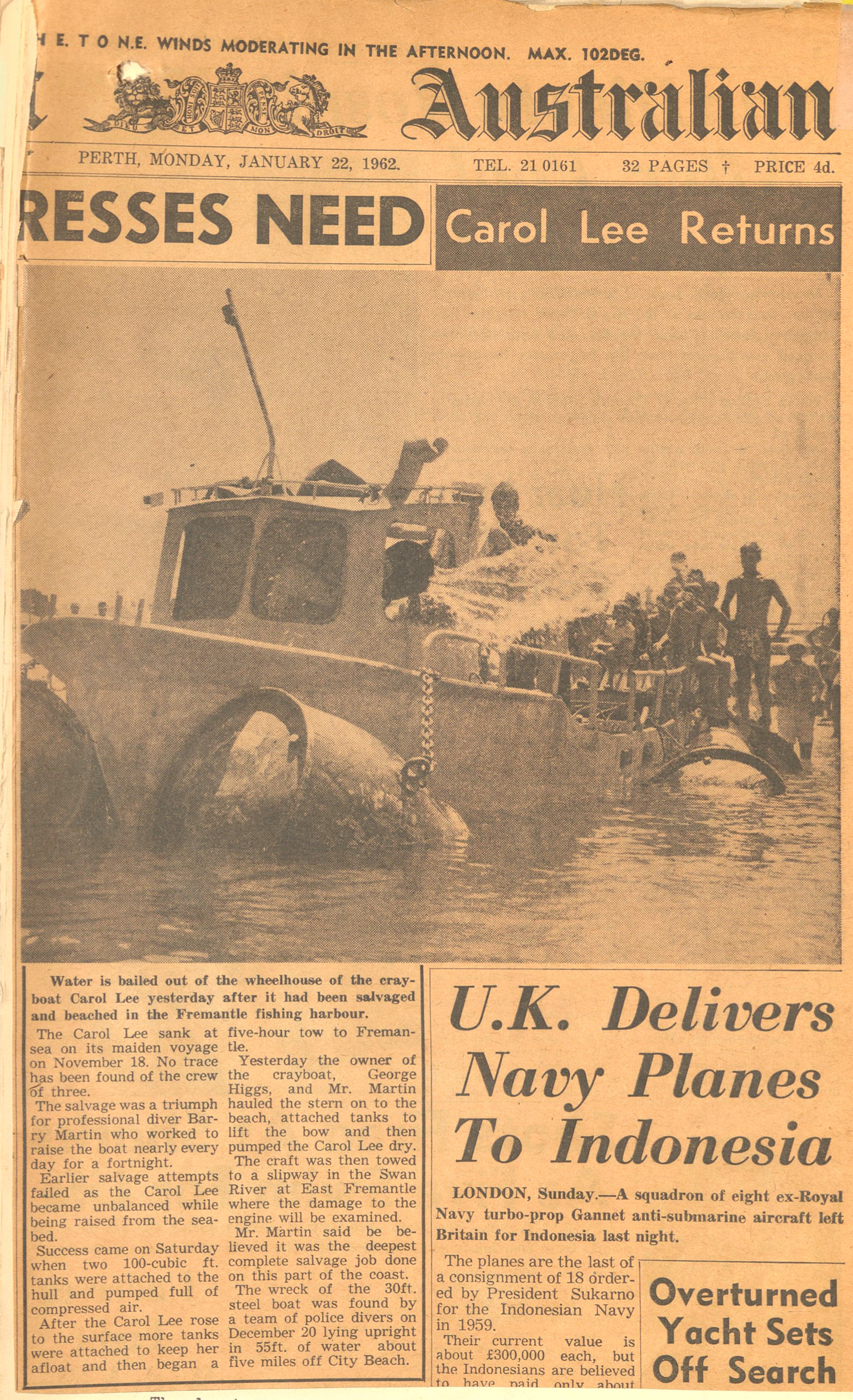 The wreck of the Carol Lee was finally salvaged on 20 January 1962, and towed to Mr. W. Langley’s slipway in East Fremantle. A young Barry Barbarich was one of the assisting crewmen in the salvage – he had lost his father, George, when his vessel the Marlene Ann had sunk off Jurien Bay in March of 1961. The Carol Lee had been underwater for two months, but within two weeks had been repaired, including the 75 horsepower diesel engine and returned to service. The engine was found to be in excellent condition, and after mud was cleared from the starter motor it ran smoothly. On 4 February the boat was taken back to where it sank to salvage further gear that had been left on the sea bed.
