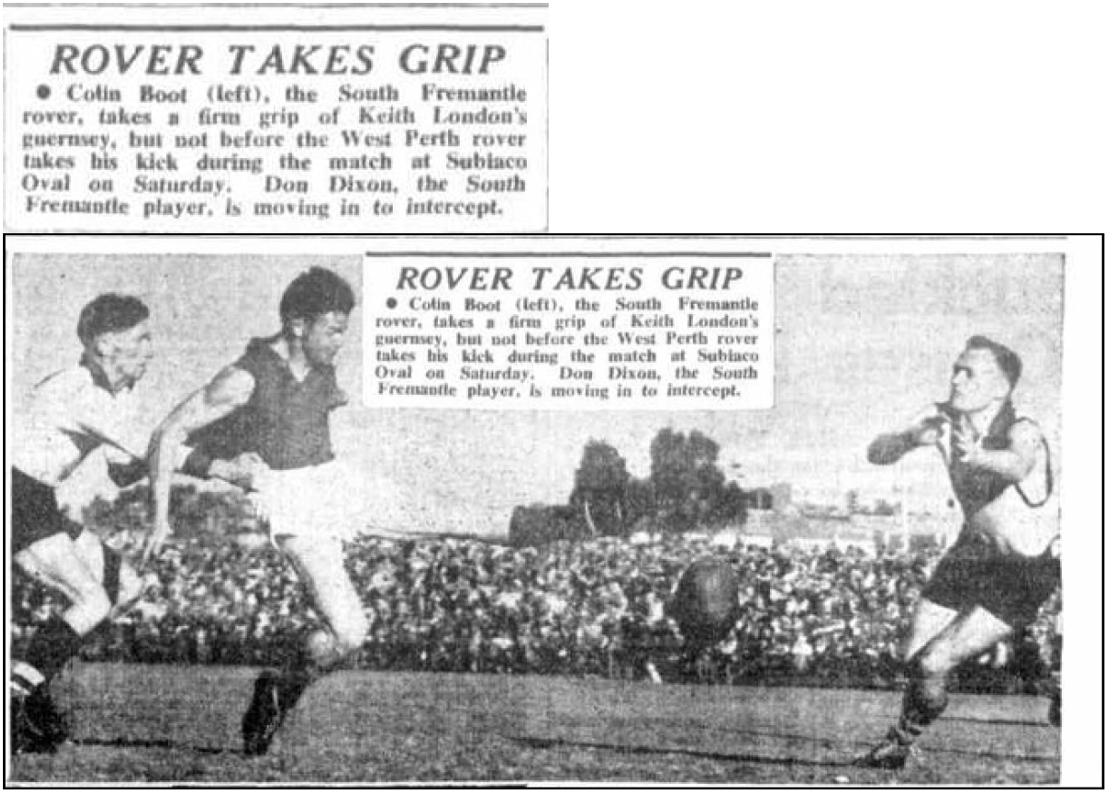 Colin Boot played for South Fremantle between 1952 and 1955 as a rover. He was last seen wearing a navy blue South Fremantle Football Club blazer as the boat left the jetty. He married Olive Mary Simms.
