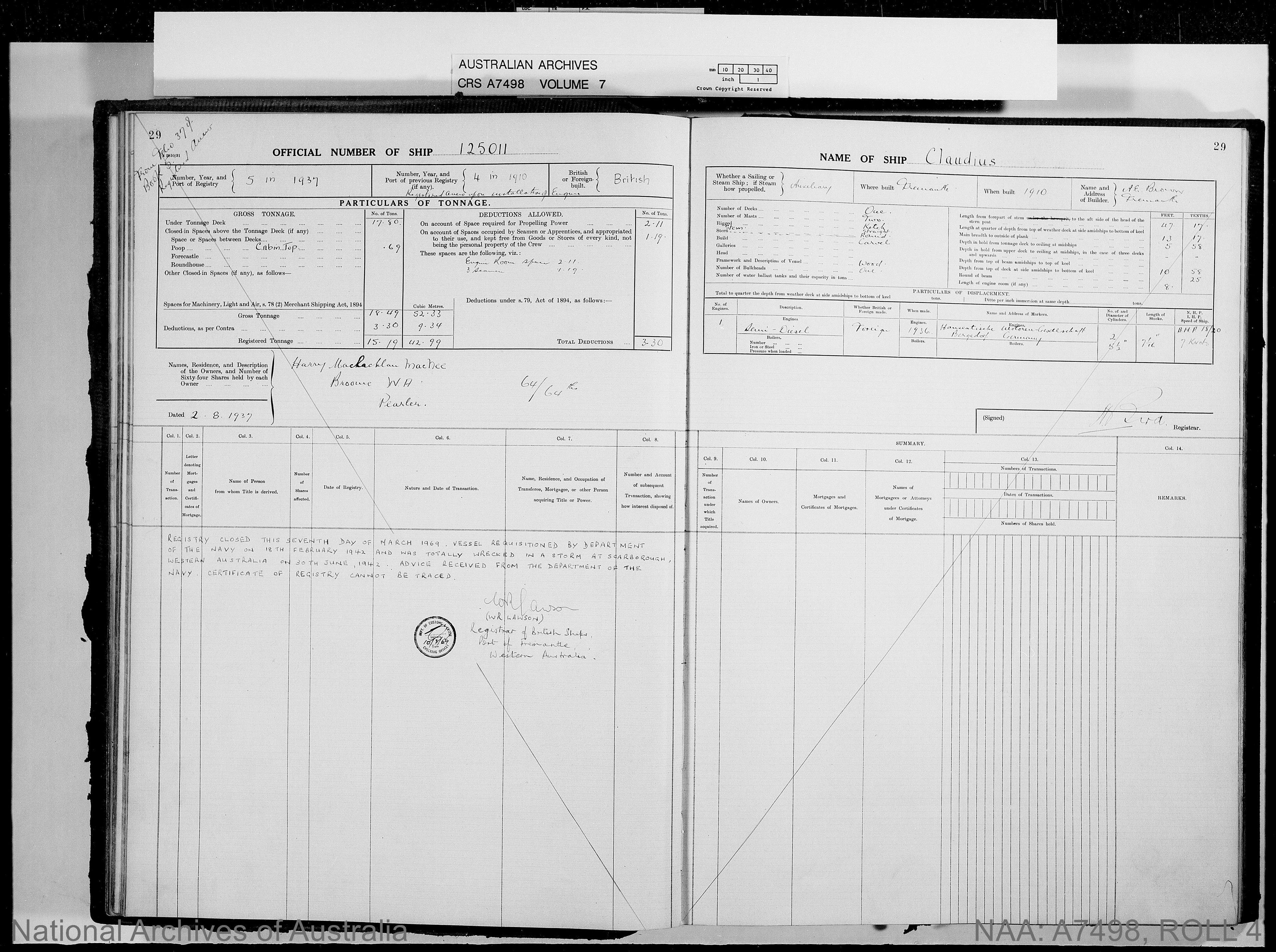 The Claudius had been purchased on the 17 September 1931 from the previous owner by Macnee on a promissory note at a value of £600. The vessel was rebuilt in 1936/37 at a cost of £550 when it was lengthened to 47 feet (53 feet overall) and a 2 cylinder, 20 B.H.P semi-diesel H.M.G engine was fitted costing £350. The contractors who did the re-build were Hezo Matsuura as first carpenter and two other Japanese assistors. All three were later interned as enemy aliens during World War 2. At the time of requisition in 1942, it was owned in entirety by Macnee. He also owned another Pearling Lugger, the Kim, and utilised Japanese and Koepanger crew to man his boats. Each boat had permits for 9 persons.