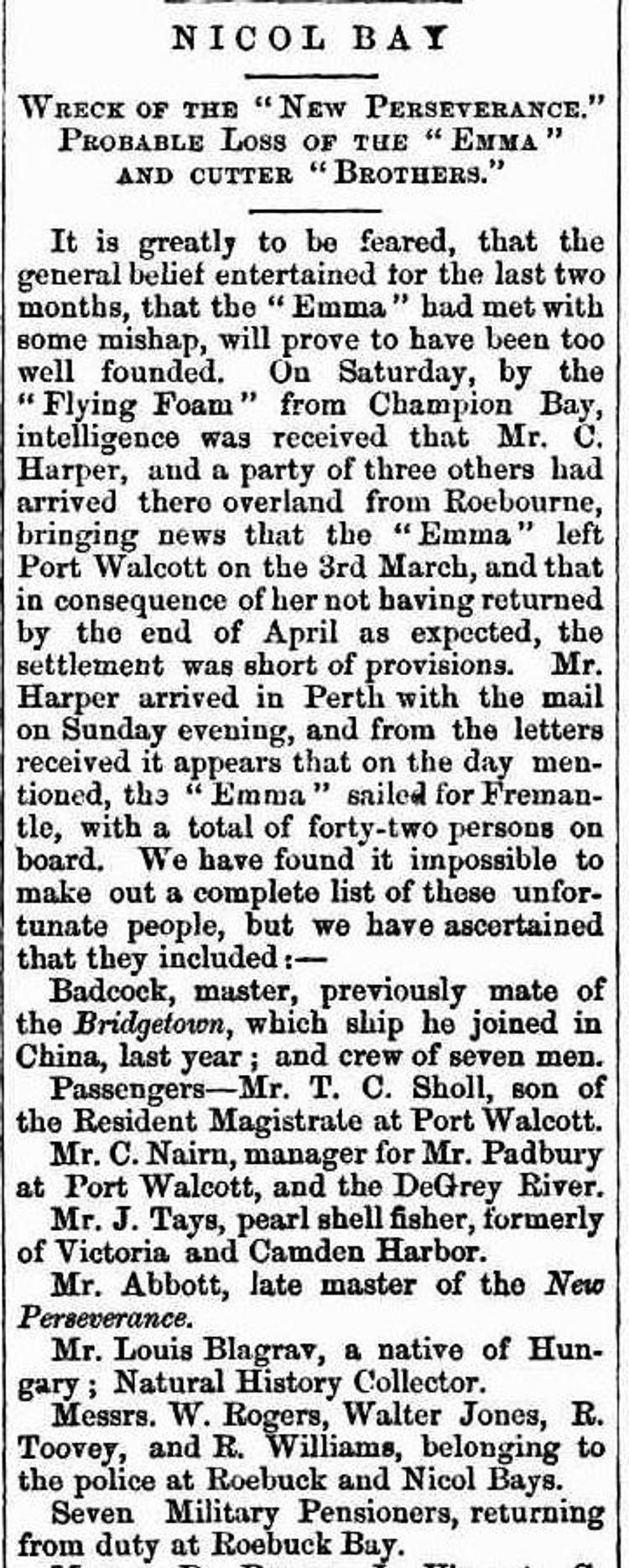 As the weeks passed without any sign of Emma, there was heartfelt grief for the families of the crew of the New Perseverance. She was wrecked and sank on 20 December 1866. The crew had been waiting for passage home since then. Some had found work in Roebourne and chose to remain in the Northwest. Captain Abbott and the remainder of his crew had boarded Emma to go home.
