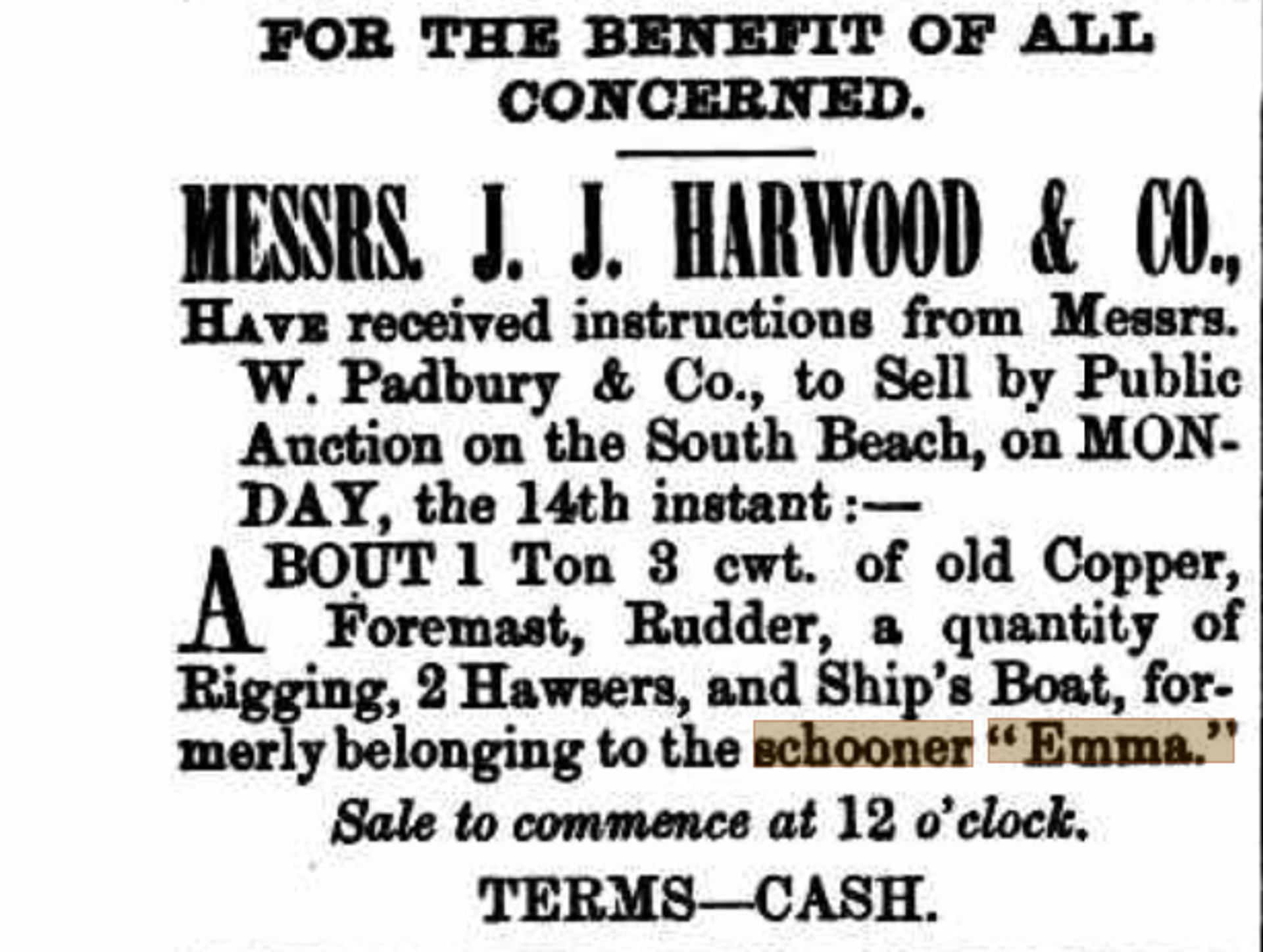 Newspapers offered theories as to what may have happened to the missing schooner, but there was no evidence to support anything they published, and there was no sign of survivors. To add to the mystery, Walter Padbury had sold fittings from Emma by auction in January 1867.