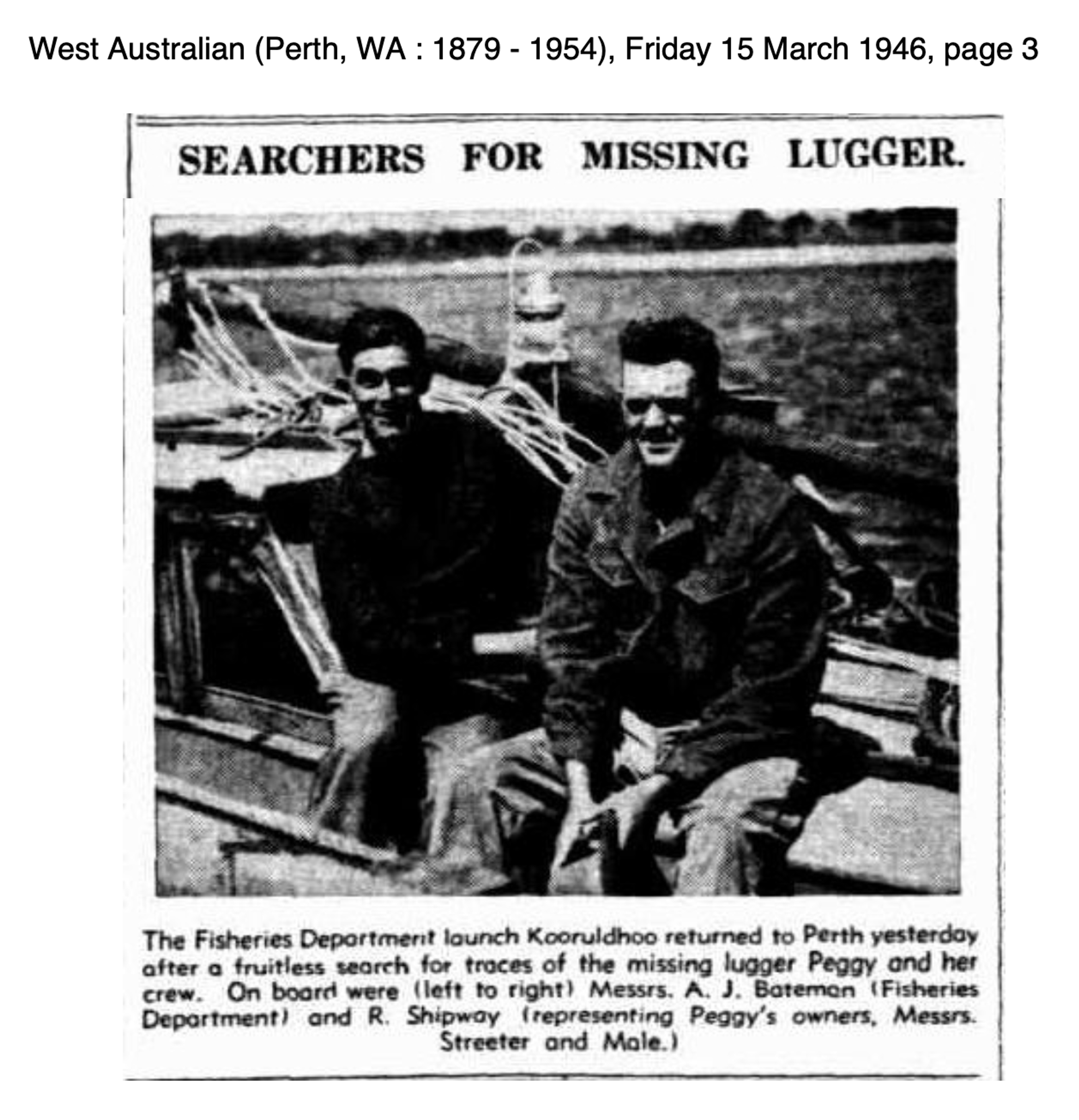By 27 February 1946 inquiries at all ports along the north-west coast brought no news of the overdue lugger. It was now 24 days since the Peggy was last sighted. It was thought that the Peggy would call in at Onslow but the owners, Streeter and Male, stated that it was not instructed to call in but was expected to. Although no heavy weather had been experienced since the Peggy left Fremantle the Weather Bureau did issue a gale warning on 8 February, however a spokesperson, Mr Akeyrod, from the Weather Bureau stated on 27 February that the gale did not develop as expected although for some days moderate to rough seas were experienced at Geraldton and Shark Bay, while further out to sea conditions might have been worse.