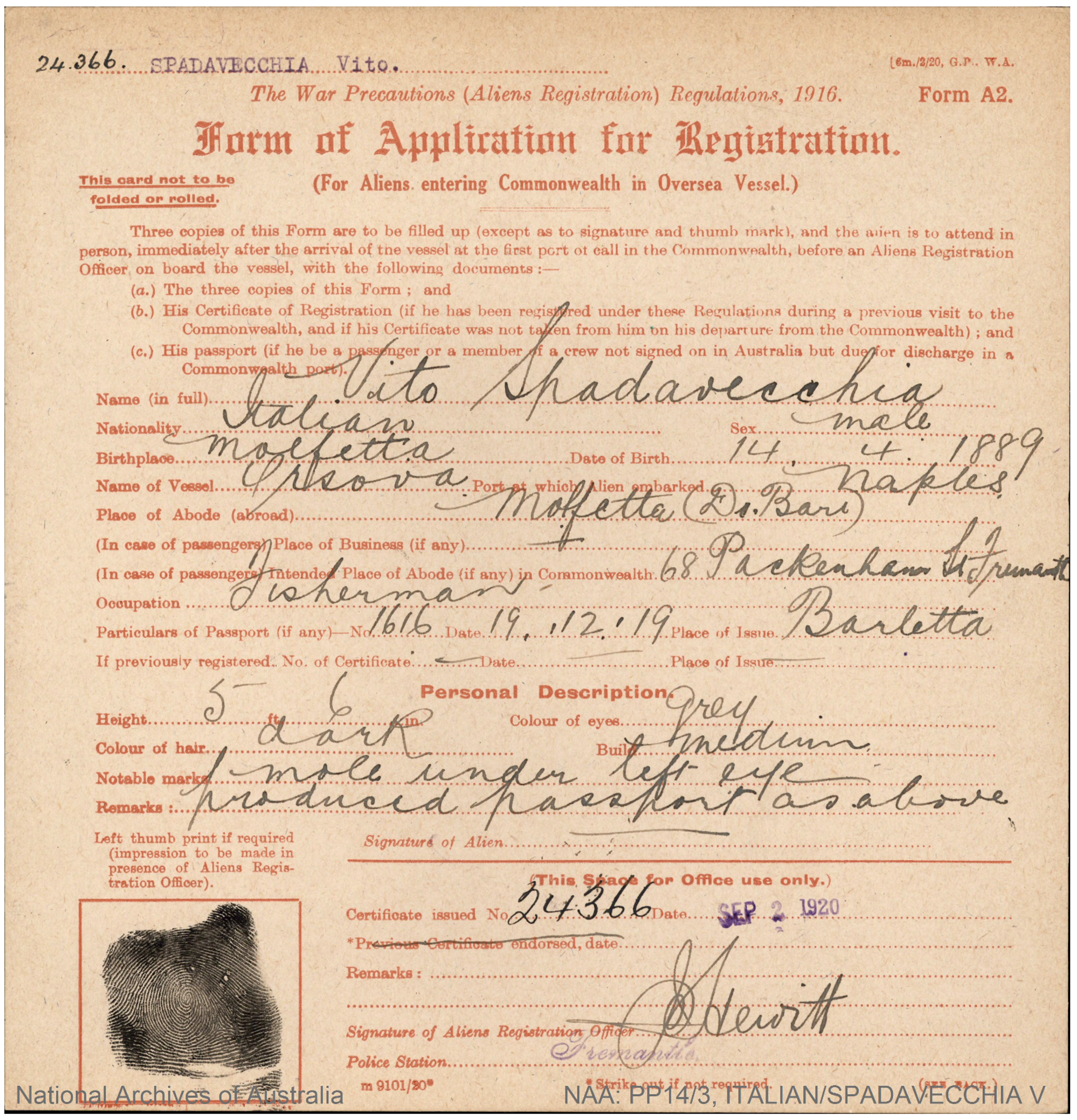 Vito Spadavecchia's Alien Registration Papers